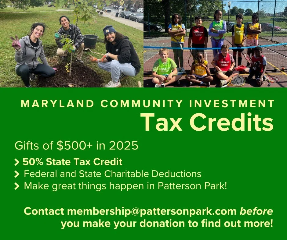 Give to support the park at $500+ and receive additional Maryland State Tax Credits through the Maryland Community Investment Tax Credit program. Contact membership@pattersonpark.com for more information and to reserve your credits!